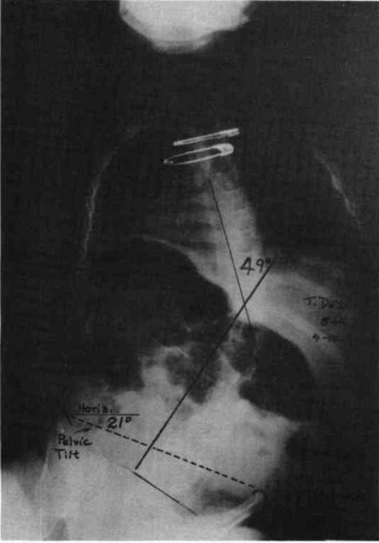 In cerebral palsy, we occasionally see a case of lateral pelvic tilt and scoliotic posture secondary to a unilateral hip extension contracture. A right hip extension contracture, if not accommodated, will cause the right side of the pelvis to be elevated. The pelvis will be tilted leftward and a compensatory convex left scoliosis will be produced. When we see this problem, it is usually an older child or adult. Fig. 12 is an example of a rather extreme case of how the deformity was accommodated to minimize pelvic and spinal malalignment and stress.