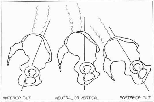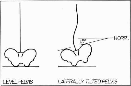 We choose the "sitting at attention" sagittal configuration (Fig. 2), because it represents a mid-range spine configuration, it allows significant weight bearing on the proximal thighs as well as the bottom of the pelvis, it is a cosmetic posture (chest and head upright, facing outward), and it is a functional posture (head in a position to observe and thorax and shoulders forming a secure base for the neck and arms to move). In the sagittal plane, the sacrum is tilted anteriorly a moderate amount. There is moderate lumbar lordosis, thoracic kyphosis, and cervical lordosis. We would further propose that the "standard" posture consists of a pelvis level and the spine straight in the frontal plane. When the left side of the pelvis is elevated, the pelvis is said to be "tilted rightward," and when the right side is elevated, it is "tilted leftward" (Fig. 3). Likewise, in the sagittal view, the pelvis is "tilted posteriorly" or "tilted anteriorly" depending on which direction the upper parts of the pelvis are oriented relative to "standard" (Fig. 4). In the transverse plane, if the right side of the pelvis is rotated forward relative to the shoulders, we would say the pelvis is "torqued leftward." We do not present this nomenclature as the most correct, but offer it for use in the absence of standard nomenclature.