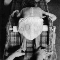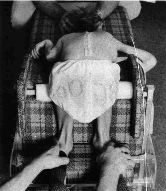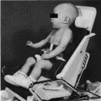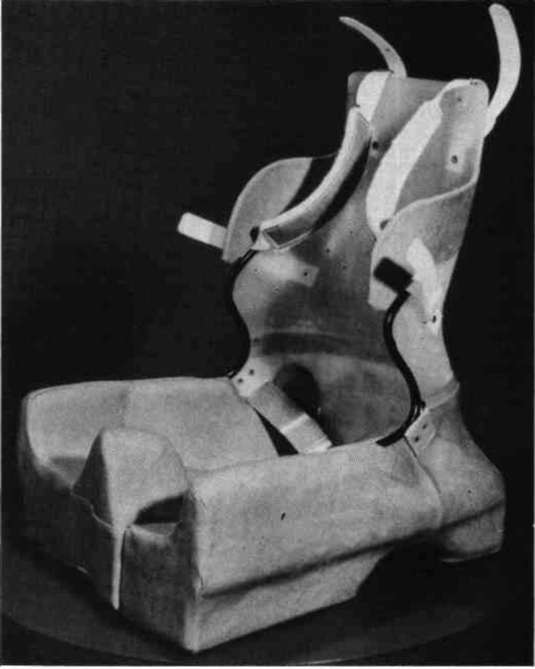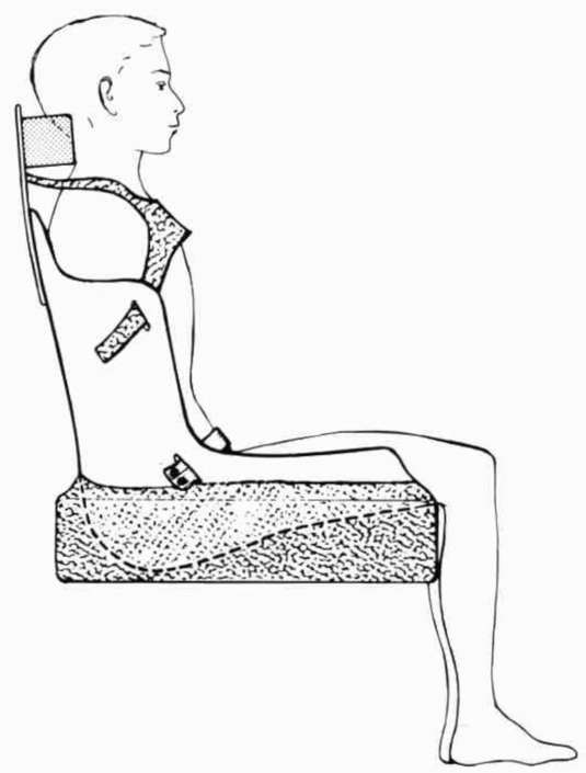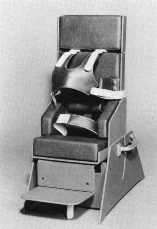The U.S.S.O. is most appropriate for children with poor-to-fair voluntary sitting capability, minimal orthopedic deformities, and less severe spastic reflex patterns. The easy size-adjustability of this design gives it some advantage over the S.S.O. for younger, rapidly growing children. For children under two years, we often utilize one of the commercial infant seat or car seat frames to which we can add support bolsters, lap belt, etc. (Fig. 36).