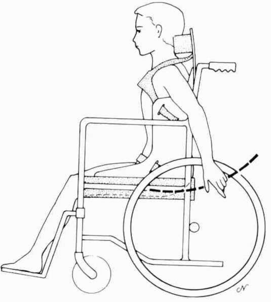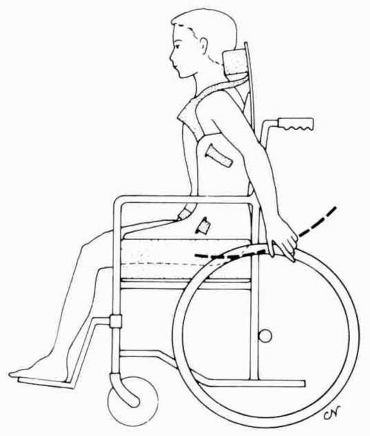 As emphasized earlier, a seating program must consider the sitting functional environment. The seating orthoses we produce are re-moveably mounted in wheelchairs, strollers, buggies, and other bases as the circumstances indicate. Being portable, they are also utilized as car seats, or to place the child very near the floor to facilitate peer interaction (Fig. 31). We have found that a seating program, to be effective, must address the full spectrum of life activities. It must also address related equipment in the sitting environment. Footrests, wheelchair upholstery, laptrays, and control boxes are some of the most common things which must be modified, moved, or completely replaced with special designs. It seems to us that the "standard" wheelchair was designed to be "slouched" into (Fig. 32) rather than to be sat erect in. Those chairs are not adequate, as manufactured, for extended use by anyone. In spite of the newer, more enlightened designs coming along, those "standard" wheelchairs are still part of the scene and must be dealt with. When we sit a client erect on a firm seat, and then place that seat in a wheelchair, the client's shoulders are far from the center of the drive wheels (Fig. 33). For clients who self-propel, the seat must be sized or shaped to sit between the upholstery mounting bars. The standard upholstry must be removed and replaced with straps so that the seat can be recessed down and back between the bars (Fig. 34 and Fig. 35).