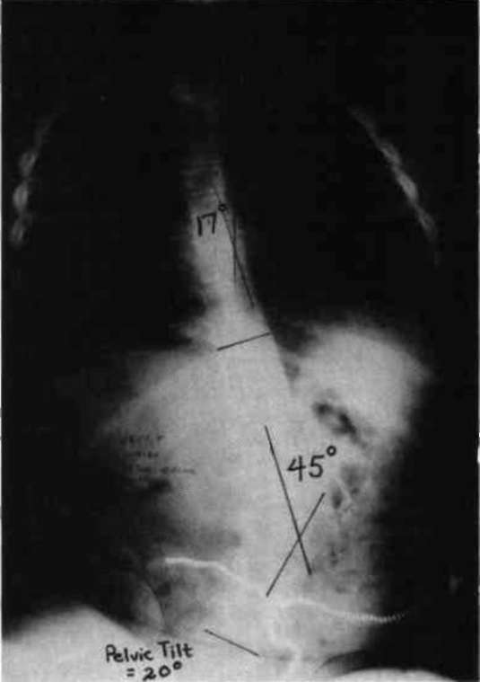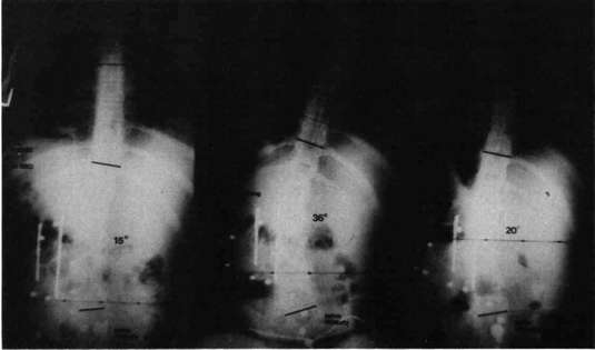 A second example is given in Fig. 9. The left and center x-rays show the progression which occurred in the eight months following fitting. During this period, the parents did not use the pelvic leveling procedure. The x-ray on the right was taken a short time after the center x-ray, with the only difference being the pelvic leveling procedure was performed before the last film. Note: once a spine deformity has become partially structural, the pelvis can be leveled only to the degree that the deformity is still flexible.