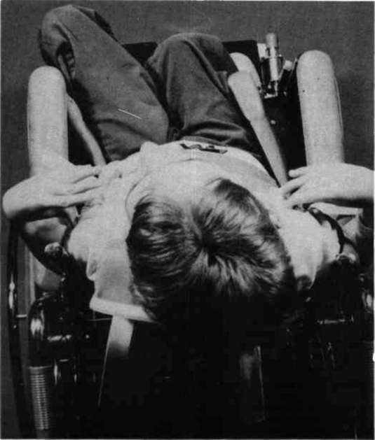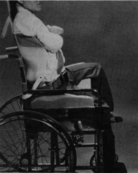 Figure 12. An extreme case of how pelvic and spinal malalignment and stress is minimized in a cerebral palsy patient.In the sagittal view, we commonly see a posture dominated by the powerful, very active hamstring muscle group. The gluteals are often helping to resist adequate hip flexion for an ideal sitting alignment. To a greater or lesser degree, the pelvis is maintained in a posterior tilt position with weight bearing shifted posteriorly toward the sacrum. This pelvic alignment tends to reduce lumbar lordosis and convert it to a kyphosis (Fig. 13). The loss of lumbar lordosis makes it more difficult for the thoracic extensors to maintain a vertical upper thorax. This explains why a flexible spine, maintained with a pelvic belt and lumbar bolster to restore lumbar lordosis, often produces better active alignment of the upper thorax and head. (We would caution you that different solutions are necessary for people with rigid hyperkyphosis.)