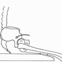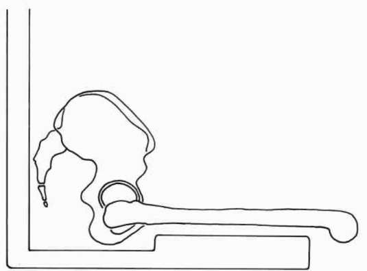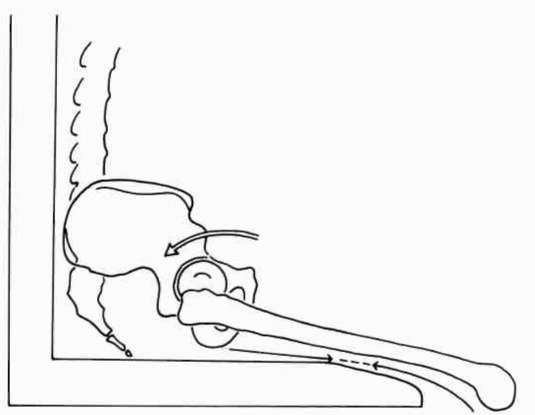 Figure 13. A sagital view illustrating the pelvis in a posterior tilt position with weight bearing shifted posteriorly towards the sacrum, converting lumbar lordosis to a kyphosis.The three forces needed to maintain the position of the pelvis and lumbar spine are the thigh support, lap belt constraint, and lumbar support (Fig. 14). Attention must be given to properly provide all three. The seat bottoms must be configured specifically to provide optimum thigh support. A flat horizontal seat bottom will never maintain hip flexion against active extension (Fig. 15). The anatomy itself calls for a depression under the pelvis to bring the femurs to a horizontal position (Fig. 16). More importantly, the hip flexion required to "break through" the extensor spasticity varies from child to child, but we usually find that some degree of seat bottom incline (pelvis to knees) is needed for the more severely involved children (Fig. 17).