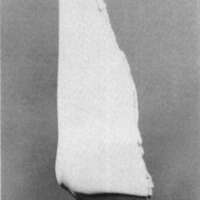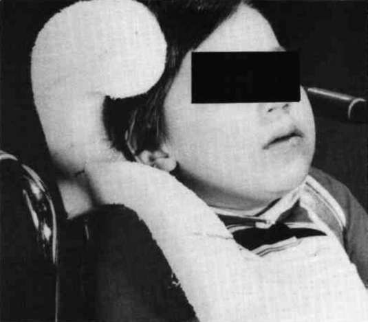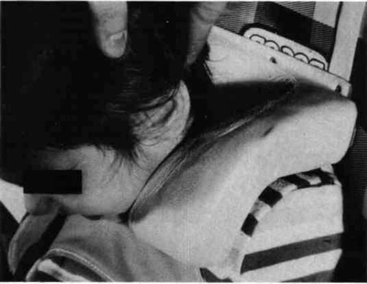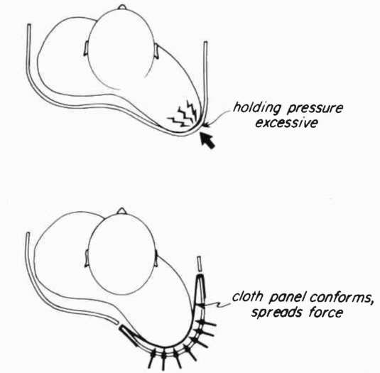Figure 25. An adjustable denim cloth panel is installed through vertical slits in the shell. The panel wraps around the prominence, conforming to the contour.Head support varies from nothing to a simple occipital prop to a variety of designs, depending on the particular challenge presented. A few of the many designs we have contrived over the years are shown in Fig. 26, Fig. 27, and Fig. 28. We do not have a good solution for the child who persists in actively bringing the head forward and down. In seating children with hydrocephalus, the sheer weight of the head presents special safety and weight bearing problems (Fig. 29 and Fig. 30).