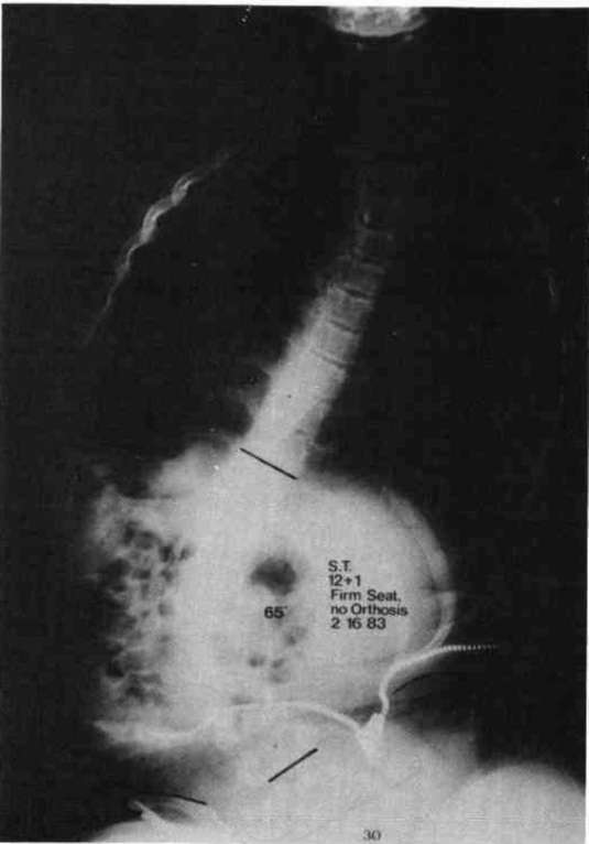 Let us now look at two examples were these stabilizing schemes have been simultaneously applied. Fig. 10a is a photo of a 12 year old boy with muscular dystrophy, sitting as he was presented to us. Fig. 10b shows the sitting support system properly applied. The corset is entirely independent; it is not attached to the seat. Fig. 10c and Fig. 10d compare his A-P spine x-rays without and with the orthotic system. The lateral tilt of his pelvis is reduced from 30 degrees to 14 degrees. The Cobb angle of his scoliosis was reduced from 65 degrees to 35 degrees. Curve control of this magnitude is not unusual as long as the deformity is still flexible. Fig. 11a is the x-ray of J.S., a 14 year old girl with cerebral palsy. She presented a right thoraco-lumbar scoliosis of 38 degrees and a rightward pelvic tilt of 8 degrees. Her shoulders were tilted 13 degrees to the left partly because she used her right arm for propping to avoid falling to the right. We provided her with a soft corset and the Gillette Sitting Support Orthosis. The Sitting Support Orthosis was to provide pelvic control and bilateral "propping" support. It had no head rest or anterior support. The x-ray taken just after fitting shows pelvic tilt reduced to 2 degrees (Fig. 11b), the Cobb angle of the scoliosis reduced to 22 degrees, and shoulders leveled. Both hands were free to function, and she said she could breathe deeper.