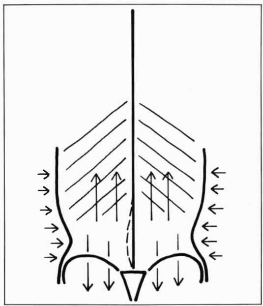 The second scheme we will discuss has to do with the Valsalva maneuver, given earlier, in which the abdominal and costal muscles function to relieve the spinal column of compression and bending loads. No matter what exactly happens during the Valsalva maneuver, the Morris explanation is a valid biomechanical analysis of how a snug corset contributes to trunk/spine stability in the presence of flaccid paralysis of abdominal and costal muscles. Engineering analysis and empirical evidence indicate that when we passively apply circumferential abdominal constraint (ie. a snug corset), a hydraulic load bearing column is created and we reduce the magnitude of flexible collapse (Fig. 6). In our experience, the corset is seldom used for children with cerebral palsy, but is virtually always useful for children with muscular dystrophy.