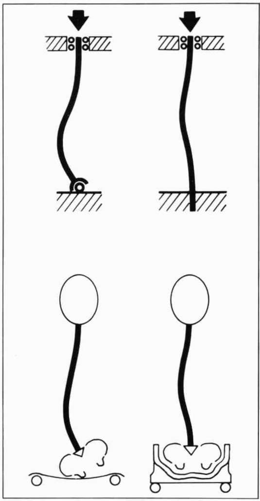 Figure 6. Reducing the magnitude of flexible collapse.The third scheme for enhancing spine stability derives from the fact that the sacro-pelvic complex forms the foundation on which the flexible spinal column rests. Voluntary pelvic control is an important component of spine stability in the unimpaired trunk. If, by a conforming design about the pelvis and a proper donning procedure, we can increase the foundation (bottom end) constraint conditions, much is added to spinal stability. The pair of diagrams on the left side of Fig. 7 illustrates the similarity between the spinal column in the case of an uncontrolled pelvis and the slender column pin jointed (free to tilt) at its lower end. The two diagrams on the right in Fig. 7 illustrate the similarity between the controlled pelvic case and the built-in base end condition. Elastic column buckling equations for the two beams indicate that the built-in beam will withstand almost twice as much load as the other before buckling. To achieve this end condition stability, we need a well made seat, as well as a procedure to level the pelvis each time the child is seated.