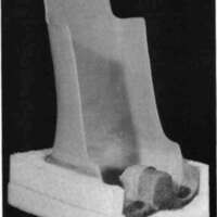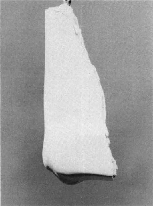 The polypropylene shell is obtained by covering a pattern developed from an impression of the child. To obtain the impression, we position the child, on a supporting fixture (Fig. 37) in a face-down, hips-flexed, knees-flexed configuration (Fig. 38). We use the weight relieving (horizontal) trunk alignment, support under the knees, and a waist belt for the precise purpose of achieving an impression which does not possess the poor alignment characteristics we are trying to avoid. The support under the knees allows us to locate the pelvis as directly as possible in alignment with the spine. For the child with tight hamstring muscles, a waist belt on the fixture helps reduce lumbar kyphosis and perhaps achieve a little lumbar lordosis, if possible. The contrasting diagrams in Fig. 39a and Fig. 39b illustrate the critical role of knee support. The hip flexion angle of the fixture can be varied and is adjusted according to the amount of hip flexion we want in the seat shell. On the positive model, plaster is added to create the bulges and contours needed to avoid pressure on bony prominences (Fig. 40). Plaster is added across the back of the upper thorax to give room for extension. Fig. 41a and Fig. 41b are posterior and lateral views of a positive model fully modified and ready for covering. The resulting polypropylene seat shell is mounted in a polyethylene foam base (Fig. 42). Final trim lines, lap belt and vest attachment points, head-rest placement, etc. wait until the child comes for fitting.
