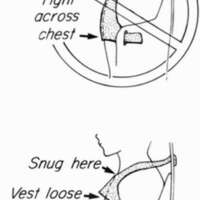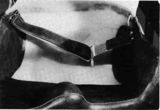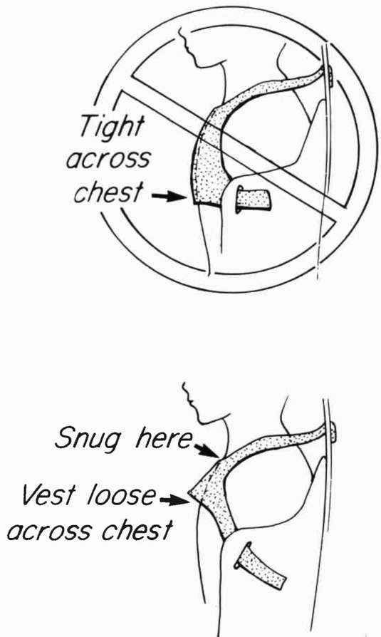 Figure 24. Anterior upper thoracic support provided by shoulder straps.In the early years, we also constructed upholstery and plywood seats. In 1983, we converted that rectangular design to one that used upholstered removeable components attached to the inside surfaces of a plastic seat frame as shown in Fig. 21. (We first saw a design similar to Fig. 21 at the Royal Ottawa Rehabilitation Center. In addition to our own changes, the present design incorporates features also learned from the Rehabilitation Engineering Center at Children's Hospital at Stanford.) To distinquish this design from the contoured plastic shell type S.S.O., we call it an Upholstered Sitting Support Orthosis (U.S.S.O.). We currently construct and fit about 200 of these units annually.
