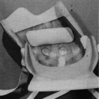 Although there have been many very significant design changes along the way, the Gillette style Sitting Support Orthosis (S.S.O.) has continued, from 1974 to the present, as a portable system utilizing a custom molded unpadded plastic shell mounted in a plastic foam base (Fig. 18 and Fig. 24). We have provided approximately 1100 of these Sitting Support Orthoses. Our present rate of S.S.O. production is about 140 per year.
