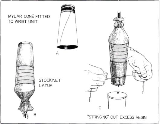 The entire layup is inverted and brush-coated with this resin mixture. The excess resin is "strung" down toward the wrist unit (Fig. 10C).
