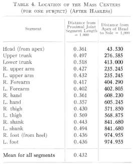 To determine the location of mass centers (centers of gravity), Harless used a well-balanced board on which the segment was moved until it was in balance. The line coincident with the fulcrum axis of the board was marked on the segment and its distance from proximal and distal joints determined. The location of the mass center was then expressed as a ratio assuming the segment length to be equal to one. Harless also tried to determine the location of segment mass center from the apex of the head by assuming that the body height is equal to 1,000. The data for one subject are shown in Table 4. From the table, the asymmetry of the subject becomes evident.