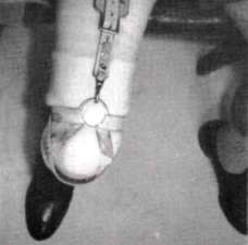 Continued experimentation led to the use of the present suspension system using two straps looped through a ring for socket suspension (Fig. 5). The suspension system consists of two straps 1 in. wide and approximately 16 in. in length. When looped through a stainless steel ring, these straps form two inverted V's with the apex of each inverted V passing through the ring. The ends of the V-straps are attached to the socket. Each strap has one end anteriorly and one end posteriorly attached to the proximal socket, thereby providing a four-point suspension. The ring joins both straps and is attached to a flexible waist belt by an elastic thigh strap. No circumferential strap is used about the thigh; a waist belt and a thigh suspension strap, plus the free-sliding characteristics of the two V-straps through the ring, provide firm suspension in all positions of knee extension or flexion.