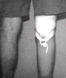 The leather cuff-suspension strap described in The Patellar-Tendon-Bearing Below-Knee Prosthesis and in the June 1962 issue of Artificial Limbs has been found satisfactory in the majority of cases (Fig. 1). However, in certain cases with short stumps suspension problems have arisen. One particular case (Fig. 2), a patient having a very short stump (2 3/4 in.), presented such a critical suspension problem that other means of achieving suspension were attempted. The first approach was a figure-eight dacron strap with Velcro for adjustment (Fig. 3). A continuous strap encircling the thigh was crossed over the patella. The ends of the strap were attached to the socket. Socket retention was improved, but some disadvantages were noted. When tightened sufficiently to provide good suspension, the strap caused a circumferential constriction above the knee impairing stump circulation (Fig. 4). Furthermore, this type of suspension did not provide an adequate extension stop for the knee.