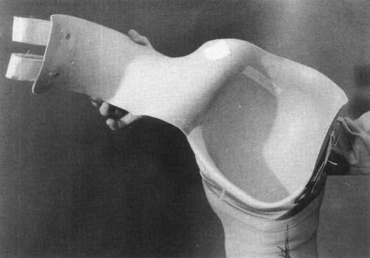 Some of the principles of the CAT-CAM™ total flexible brim are also utilized in this type of hip socket. The entire socket is flexible except in the area where the hip joint is attached. This can be accomplished in two ways: first, with a rigid frame and a flexible inner socket much like with the CAT-CAM™ and SCAT-CAM™ above-knee design; second, by a heterogeneous monolithic polyester socket that is rigid in the joint area and then gradually becomes flexible throughout the remainder of the socket (Fig. 4 and Fig. 5).
