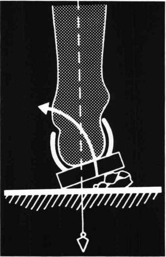 This means that the heel-strike is lateral and as pressure is exerted, it then turns inwards and adapts to the surface whereby it has returned to the original standing position. The distortion between the fore- and rear-foot, combined with an inadequate heel counter, produces a potential risk of injury. A stone on an inclined surface can easily lead to a strained joint (Fig. 11). This phenomenon is particularly significant for sportsmen and joggers who train in open country. After suffering such strains, the fear of further injury can hinder training.