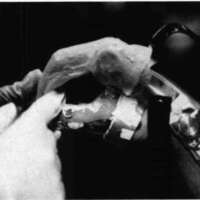 The impression is prepared for filling by enclosing it in plaster bandage and coating the inside with a thin layer of liquid soap. A small mandrel should be contoured to fit the inside of the impression, extending as far distally as the tips of the fingers to prevent fracturing of the positive model (a length of 1/2" O.D. aluminum tubing works well for this). The impression is filled with plaster of Paris and stripped, using great care not to fracture the positive model. The model will have good detail, showing the contours of the finger nails, skin lines, and MP mounting plate.