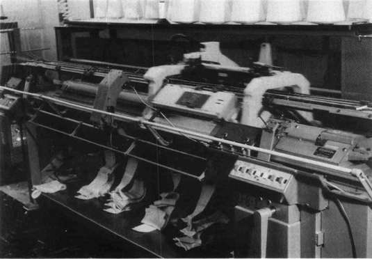 Since our aim was to develop a sock which would be fashioned to give greater pressure distally, less pressure proximally, and have a rounded toe to shape the distal end, the flat, V-bed type machine was employed. Fig. 3 is a close up of the carriage and the needle bed where needles are picked up or dropped according to machine programming so that wid-enings or narrowings (fashionings) can be made. All standard prosthetic socks are full-fashion knit in this way, with gradual wid-enings up both sides of the sock. To give even greater rounding, a new widening for the toe was programmed. On circular machines, as used for most currently available shrinkers, widening can only be achieved by loosening the knitting tension. Knitting a rounded toe on a circular machine is not possible.