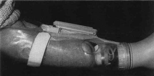 Figure 9. Close up view of preparatory below-elbow prosthesis. Hook Velcro® adhesive backing is used to suspend the electrode in the prosthesis. Previous incorrect electrode site is repaired with cut-out from new electrode site. Battery pack is held in place with adhesive backed Velcro® as well.Since 1982, 25 upper extremity amputees have been fit with this system. It has allowed us to closely monitor the development of the maturation process of the residual limb. Adjustments to the prosthesis have been made with minimal fabrication time. Total replacement of the preparatory prosthesis was only necessary in two cases. All other cases could be accommodated by modifying existing prostheses. All but one patient (forequarter amputation) went on to fitting and delivery of their permanent prosthesis. The results of these patients' permanent prostheses are consistent with the findings of Malone, et al.
