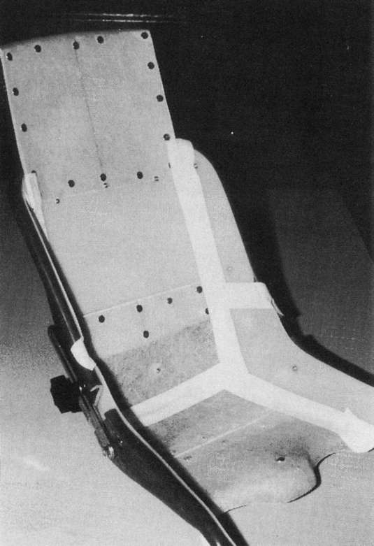 Figure 5. Foam rubber pieces have been glued in place and ground to proper contour and fit.Another solution is used for children with extensive spasticity. After selection of the proper size seat shell and inner-liner, the child is covered completely, including legs, arms and head, with layer of foam rubber and isolated by a piece of plastic foil or film. This is to prevent polyurethane foam from coming into direct contact with the patient's clothing or skin and to prevent burns. The patient is then positioned as well as possible in the modular seat shell. This is preferably done by the therapist or the mother of the child so as to prevent spasticity as much as possible and to optimize the posture of the child.