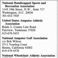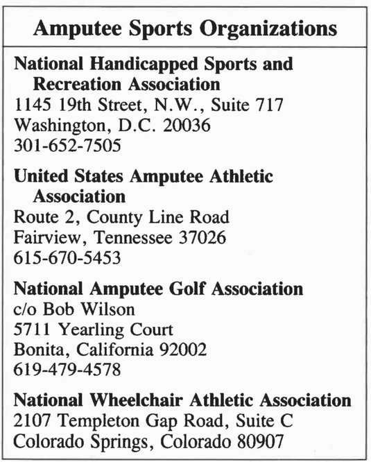The perceptions that amputees have of their capabilities has risen dramatically in the last decade. Paralleling the growth of competitive sports for amputees has been the organizations that provide the forum for these activities (Table II). Prior to these organizations bringing together amputees from around the nation and the world, there was little opportunity for exchange of ideas on the consumer level.