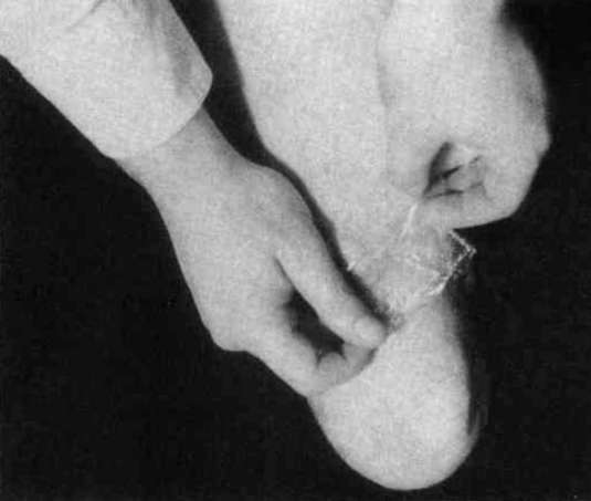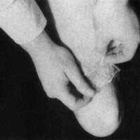 Figure 2. Applying 2nd Skin™ to a residual limb abrasion.One of the problems with most skin protection materials is that suction socket wearers cannot utilize them. When the amputee pulls into the suction socket, "2nd Skin™" or "Spenco® Skin Care Pads" become displaced and usually do not cover the areas intended. A product that can be of use to suction socket wearers, or any amputee for that matter, comes with a variety of names. It is a transparent dressing with one adhesive side that is paper thin and porous both to air and water. The trade names are "Op-Site," "Bioclusive," "Tega-derm," and "Acuderm" (Table 1). This material can be applied directly to the skin and acts as another layer of protection, while still allowing normal dermal respiration and perspiration to occur. It can be left on the skin for four to five days before it needs to be removed. If left on much longer, the epidermis does not get an opportunity to slough off properly.
