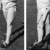 Figure 3. Series of photographs taken from video screen.It is easier to implement this system if the patient is using an exoskeletal prosthesis, since the cable and housing have a natural surface to ride and sit on. However, we have placed several on endoskeletal systems with a little creative rigging (Fig. 4). It is also possible to laminate a track directly into the thigh portion of the prosthesis which eliminates the need for housing. However, this sometimes causes excessive breakage unless a section of housing is extended distally to reduce the bending radius distally about the knee.