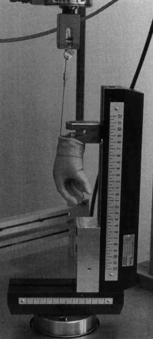 The second test performed was to assess the prehension gripping forces that are created with each device. With the hand in a horizontal position, the base of the test machine was attached to the thumb, or one hook half, with a cable. The phalanges, or other hook half, were attached to the cross head and load cell of the test machine via a cable (Fig. 4). The prosthesis was started in the full open position. A plot of grip force verses grip width was created by allowing the device to close at a constant rate of 4" per minute (Fig. 5). From these plots, the parameters "G," "H," and "I," were calculated for use with the generalized graph (Fig. 6). It should be noted that the plotting direction of these curves was opposite to those discussed in Figures 2 and 3. Since the hand was started full open, maximum prehension grip force "I" and the full open grip width "F" are plotted first. The force plotted here represents the force created by the device upon its own closing. The force necessary to pull the appendages open would be greater than this force, due to friction. In Fig. 6, "G" is referred to as the initial prehension force. This is the force created just prior to the grip closing completely. Also, the prehension grip force constant, "H" is the slope of the unloading curve between fully open and closed positions of the terminal device. With the parameters "F," "G," "H," and "I," an approximate reproduction of prehension grip force verses grip width can be created.