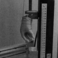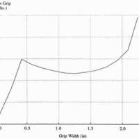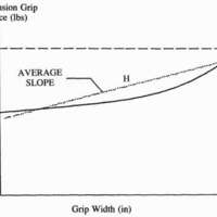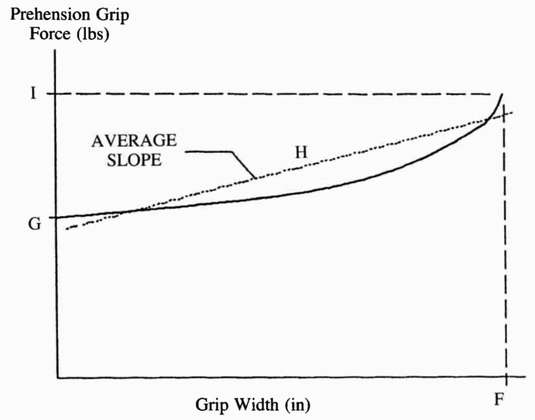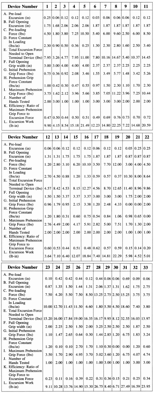 The pre-loading force "C" and the force constant "D" are useful parameters in assessing the function of a terminal device when the amputee can marginally create the forces and excursion necessary for full opening. In marginal cases, large pre-loading forces will limit the function of a device. For example, although the UCLA CAPP, device number one, only takes eight pounds to open fully, a patient must be able to create at least 4.5 pounds to start the device in motion. Without regard for the pre-load, one might incorrectly think that four pounds of excursion force would open the device halfway. A terminal device with a high pre-opening excursion (more prominent in hands) could be used on an amputee with good strength initially, but might have weakness toward the end of the excursion range. This is particularly true for higher levels of amputation which rely more on scapular abduction and less humeral flexion. Another important factor to note is the grip performance of the terminal devices. Here the full open grip width "F" and maximum prehension grip force "I" are the important notable values.