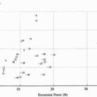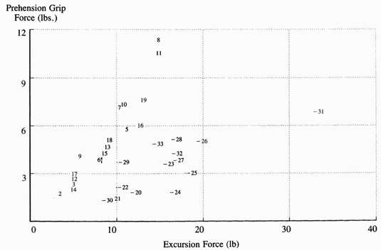 Plotting maximum prehension grip force against total excursion force, the relative performance between hooks and hands can be compared (Fig. 7). For clarity, the hand device numbers were plotted with a preceding dash. For any particular excursion force, it can be easily seen that grip force is greater for the hook devices. The devices 7, 8, 10, 11, and 19, were particularly good performers, which required excursion forces less than 15 pounds, and created prehension grip forces greater than seven pounds. In light of this comparison, it should be challenging for terminal device designers to come up with functional hand devices that approach the efficiencies of hooks.