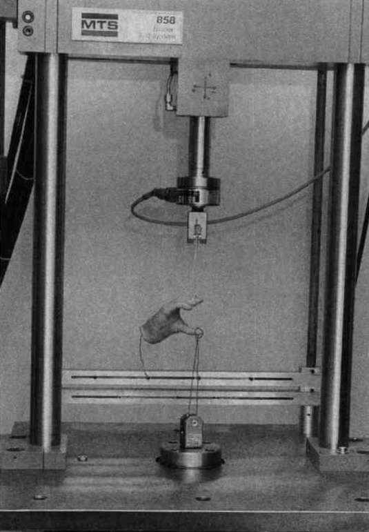 All test data presented here was accomplished on a MTS-858 universal materials testing machine. With this hydraulically powered machine, a piston-like cross-head can be positioned accurately, while loads created on the test specimens are monitored. The degree of sophistication of this machine is not critical to the test protocol. Any testing apparatus can be used as long as displacement and created force can be measured accurately.
