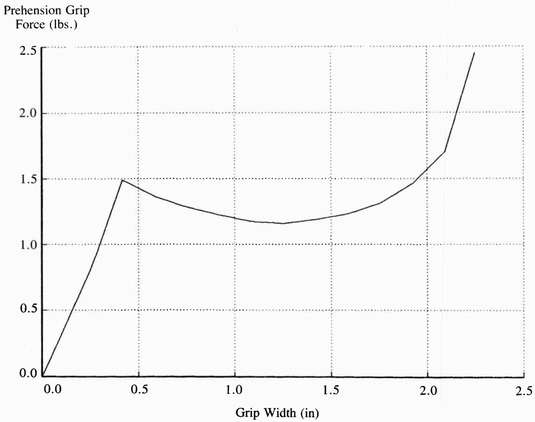 Figure 4. A 2.5" U.N.B. STEEPER set up for prehension grip testing on the MTS-858 universal machine.Figure 5. Experimental plot of prehension grip force vs. grip width for a 2.5" U.N.B. STEEPER. This plot was started with the hand full open, a 2.25" grip width, and 2.5 lb. grip force. The steep slope at approximately 0.4" is where the inner locking mechanism activates. The hand is essentially closed at this time.