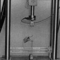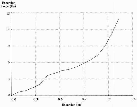 Figure 1. A 2.5" U.N.B. STEEPER set up for excursion testing on the MTS-858 universal machine.Figure 2. Experimental plot of excursion force vs. excursion travel on a 2.5" U.N.B. STEEPER terminal device. Notice that at 0.45" the characteristics of the curve changes. This is the point (A,C) at which the hand just begins to open.