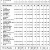 Table I lists the measured parameters derived from the two tests of 33 terminal devices. Of the 12 parameters listed, the first nine were described previously in the test protocol section. The J-th parameter is the number of different devices tested of each type. When more than one device was tested of a particular type, results were averaged. The criteria for testing most of the devices was based on local availability. The ratio of maximum prehension grip force to excursion force is often called the efficiency of a terminal device. The K-th parameter is the measured efficiency. The last parameter, listed as "L," is that of the work required to open the terminal device by pulling the actuator cable. Work is defined as the excursion force times excursion length and is measured by calculating the area under the force-excursion curve. This parameter can be estimated to reasonable accuracy by considering the area under the generalized force-excursion curve (Fig. 3). The work, or area under this curve can be calculated as: