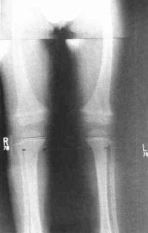 A white male, age 3, was presented at the orthotic clinic by his parents because of bowing of his right lower extremity (Fig. 4). Clinical examination showed bilateral tibia vara. Bilateral standing AP radiograms were obtained. The E-M angle determined on these radiograms was 20° bilaterally (Fig. 5). The child was fitted with the bilateral KAFO's (Fig. 6A) and a new set of standing AP radiograms was obtained which showed no difference in the E-M angle at that time (Fig. 6B).