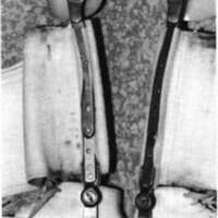 Figure 1. Bilateral KAFO's for Blounts with stainless steel medial side bar, thermoplastic femural section, and elastic tibial strap. Femural section protects the knee joint while the elastic applies maximum force to the apex of the tibial curve.A dynamic system was used to apply corrective forces to the tibia. The use of an elastic material to provide dynamic forces has been well documented. A six-inch wide elastic gusset material with velcro closures provided an adjustable and continuously applied force to the tibia (Fig. 2). The maximum force applied to the limb with the elastic material is at the apex of the curve (Fig. 1). This allows the maximum amount of correction with minimum amount of force. The velcro allows easy removal for laundering. All orthoses are provided with two sets of elastic straps.