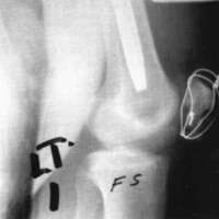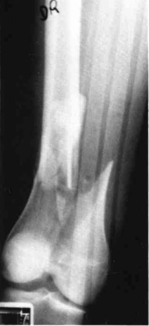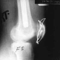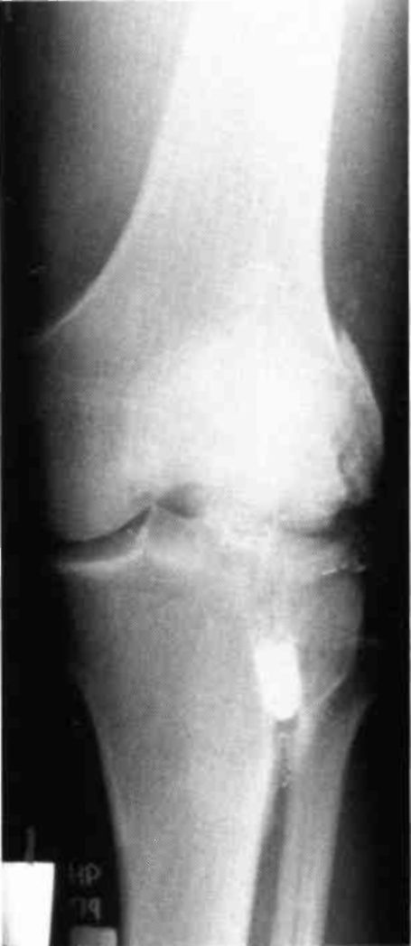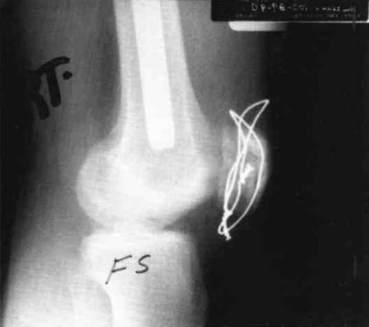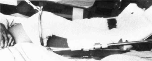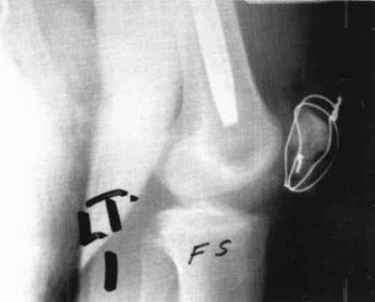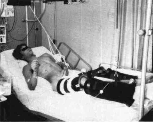 A twenty-nine year old male sustained a high caliber gunshot wound to the left knee (Fig. 4), traversing the lateral femoral condyle through the joint space and through the lateral tibial plateau. Open reduction internal fixation (ORIF) and ligamentous repairs were made. Postoperatively, the patient was placed in a standard cast brace due to the inability to provide adequate medial-lateral stability of the knee surgically (Fig. 5). The cast brace was attached to a continuous passive motion dynamic suspension system to restore and maintain motion (Fig. 6). At the time of the initial cast bracing, the patient had considerable soft tissue edema about the knee. The use of passive motion quickly reduced that swelling to the point where the cast brace provided little support. After one week, the cast brace was reapplied with the addition of a varus producing strap (Fig. 7) and the patient began ambulation training and was discharged. (If atrophy or swelling should continue, the varus producing strap can be easily adjusted to maintain force on the knee and another cast change would not be required).