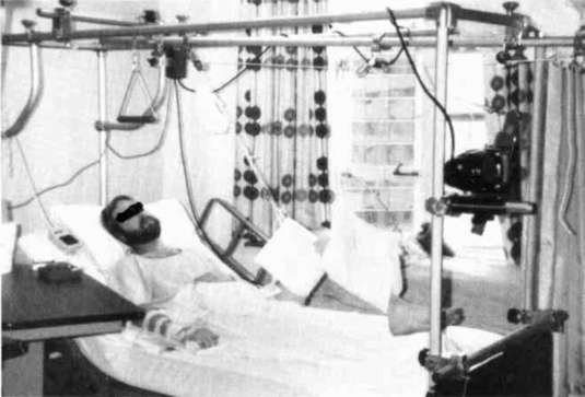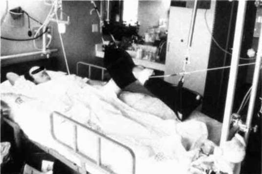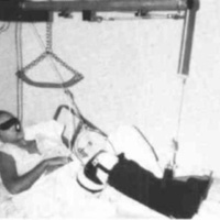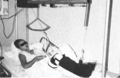 Figure 2. Home grown unit using Sutter K-10 motor and control system.Figure 3. Patient with right acetabular fracture with 30 lbs. of tibial traction in continuous passive motion (3D Passive Mobilizer). Hip flexed 0-90° and kept abducted.