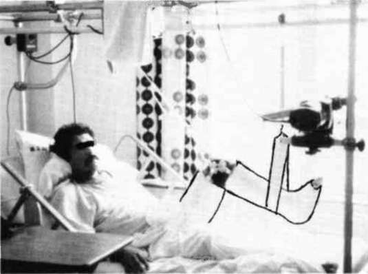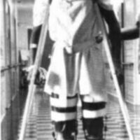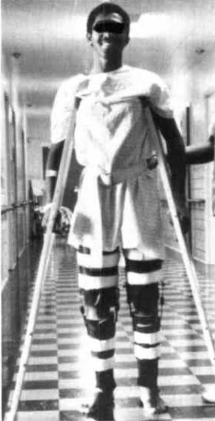 An eighteen year old male sustained bilateral femur fractures and bilateral patella fractures. The patient underwent bilateral closed inter-medullary (IM) rodding of the femur and the patellas underwent bilateral ORIF (Fig. 15 and Fig. 16). The patient was placed in a free knee Mobilizing Brace on the left leg and attached to a continuous passive motion dynamic suspension system immediately postoperatively. The right leg was maintained in a straight position and in a denotation boot to prevent the fractured femur from spinning on the IM rod. In two days, the left knee had 0-90° of pain free passive motion. Active motion on the right lower extremity was limited to 0-15° of motion. At that time, the patient's right leg was placed in a free knee Mobilizing Brace and bilateral passive motion begun (Fig. 17). Right leg motion progressed to 0-90° passive motion in four days, while the left leg was maintained in the 0-90° range. (This passive motion device, providing bilateral application from one power source, can be adjusted for varying degrees of motion independent of each other by varying the tension on the attachment lines.) Ambulation training began utilizing the bilateral Mobilizing Braces with drop locks in position (Fig. 18). The patient was fully ambulatory with this system, achieved full range of active motion in ten days, and was discharged. Passive motion was maintained for a longer period than normal due to the degree of articular damage to the patellas.