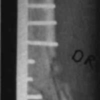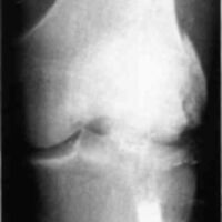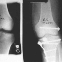 A nineteen year old male sustained a distal fracture with a split condylar fracture to the right leg (Fig. 10) and a lateral condyle fracture on the contralateral side (Fig. 11). Fractures were stabilized, but were not internally fixed at time of admission because of emergency vascular repairs being required. Three days post injury, the patient underwent ORIF of his fractures (Fig. 12 and Fig. 13). The right leg was placed in a free knee Mobilizing Brace and the left leg was placed in the rehabilitative free knee orthosis. A continuous passive motion dynamic suspension system was placed on the lower right extremity (Fig. 14). The lower left extremity had normal pain free motion following surgery. The patient was kept in passive motion for five days and achieved 0-100° of pain free motion. A cast brace was applied on the right extremity; the patient received gait training and was discharged.