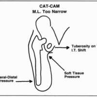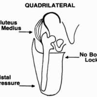 When the abductors fire, what is most likely to occur in a rectangular socket with a wide M-L dimension and no bony areas for the socket to lock against medially? The answer we have discovered, is that the femur tends to abduct. In quadrilateral sockets, the ischial tuberosity is sitting on top of the ischial seat and is free to shift about (Fig. 1). As the gluteus medius pulls the femur into abduction, the pelvic slides medially on the ischial seat and makes the abduction worse. The unsupported femur has little choice than to drift into an abducted attitude within the wide M-L quadrilateral container. Pain at the distal femur and at the proximal medial area is due to this abducted position and excessive soft tissue pressure medially.