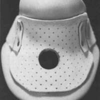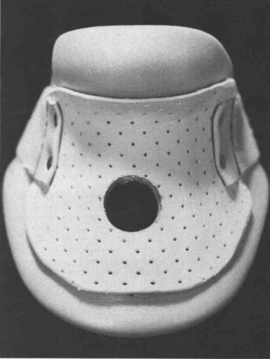 Since a number of ICU patients have required a tracheotomy it became necessary to modify the Philadelphia cervical orthosis. The design modification created by staff orthotist Wallace Whitney, CO is seen in Fig. 2 and Fig. 3.