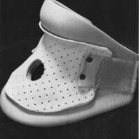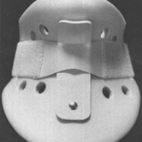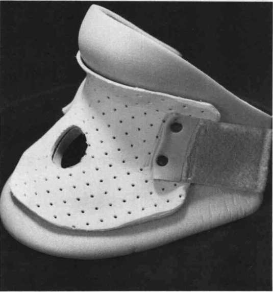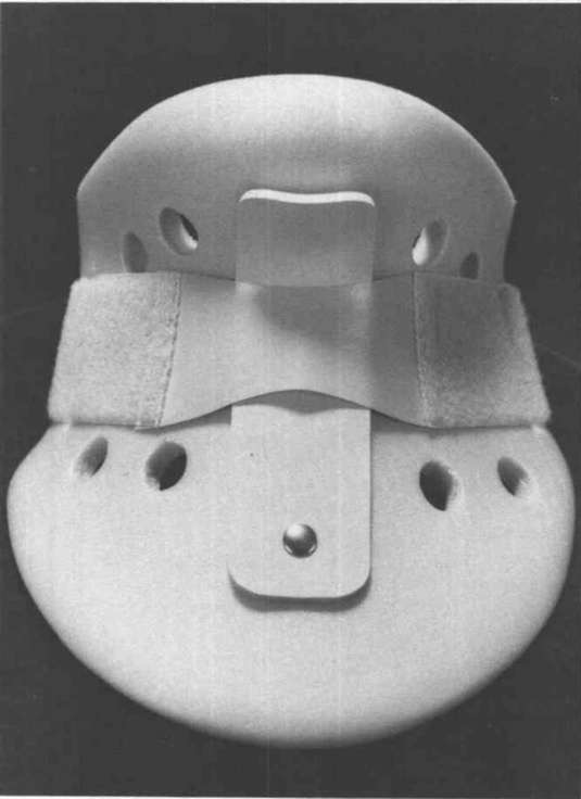 In recent years the plastazote® (Philadelphia) cervical orthosis has become a highly prescribed device for several reasons (Fig. 1). Most importantly, the orthosis limits flexion and extension of the cervical spine as well as rotation between C-3 and C-7 and patients find it reasonably comfortable and accept wearing it. This is due, to some extent, to the fact that the low temperature, and easily moldable plastazote® conforms in time to the patient's contours. The better distribution of pressure and comfort for the patient may provide more relaxation of the para-cervical spinal