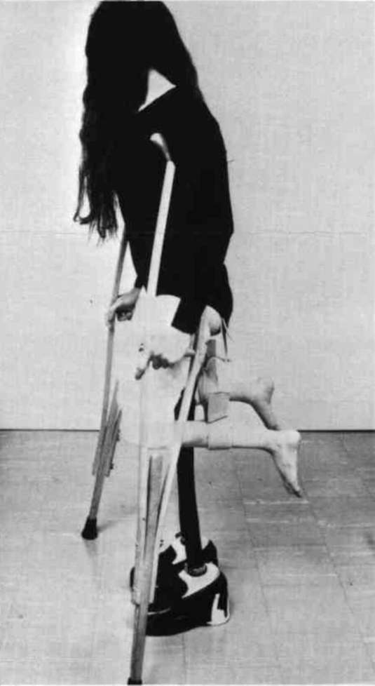 The patient wore bilateral, conventional KAFO's with knee locks and both ankles set in plantarflexion. Her feet rested on approximately nine-inch cork lifts set inside the calf sections of tall leather boots. (See Fig. 1) The patient related that as an adolescent she increased the lift height periodically to compensate for the lack of normal lower limb growth. She displayed excellent balance and body awareness, ambulated and climbed stairs and curbs independently with axillary crutches, and was able to negotiate sitting and rising from most types of seating. She led an active life as a college instructor and graduate student.