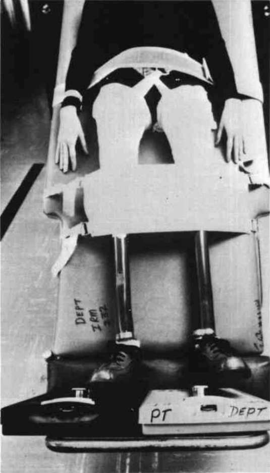 With the above general review of the clinical advantages and precautions of IPSF in mind, it may be illustrative to present a case which is representative of these aspects of this treatment approach and yet extraordinary in view of the history and personal motivation for seeking treatment. The patient was a 28 year old woman who had contracted anterior poliomyelitis at the age of 16 months. She presented with stunted lower limbs, and muscle power at both hips was below functional levels except for the ability of the Sartorious muscle to withstand moderate resistance bilaterally. The knees and ankles were essentially flaccid. Sensation throughout the lower limbs was within normal limits. No contractures were evident and upper body strength was above normal.