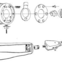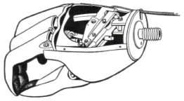 Rapid interchange of terminal devices and positive locking of the terminal device in the pronation-supination plane are afforded by the Hosmer F-M (Fletcher-Motis) unit (Fig. 7). A serrated steel adapter with an annular groove is attached to the stud of the terminal device by threads. To connect the terminal device to the arm, the stud is forced into the wrist unit until a locking yoke and gear segment are engaged. To adjust the amount of rotation of the terminal device, the control button is depressed to the first detent, which releases the gear lock and permits rotation since the terminal device is retained by engagement of the locking yoke in the annular groove on the adapter. Further depression of the control button disengages the locking yoke and permits removal of the terminal device. A coiled compression spring attached to the end of the adapter facilitates operation of the F-M unit.