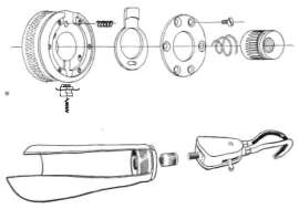 Locking action of the Hosmer elbow unit (Fig. 14) is accomplished by permitting two tightly wound coil springs to wrap themselves around a shaft. Such an arrangement permits an infinite number of locking positions. Attachment to the arm and forearm and operation by the amputee follows the same pattern as in the case of the Northrop Model C.