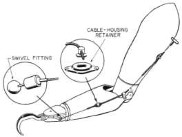 For terminal-device operation and forearm control, Bowden-type controls, along with such parts as retainer and terminal fittings specially designed for use on artificial arms, are available from a number of sources for both the harness and cineplasty applications. This type of control system (Fig. 16), consisting of high-strength woven wire cable enclosed in a wrapped-wire housing, has proven infinitely more satisfactory than anything else used to date, mainly because of its resistance to stretching and its relatively high power-transmission efficiency.