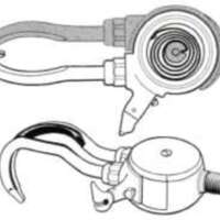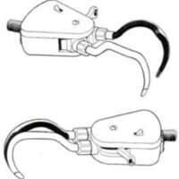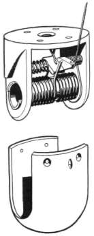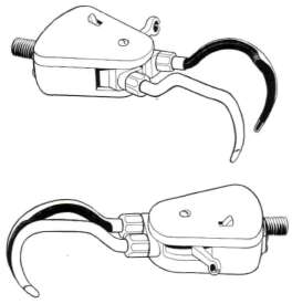 In the Northrop-Sierra voluntary-opening two-load hook (Fig. 4), designed primarily for bilateral amputees, tension on the control cable causes one hook finger to open against a spring force, which in turn provides prehensile force between the hook fingers when there is no tension on the control cable. The spring force is provided by two identical coil-type springs. When both are engaged, a prehensile force of approximately 7 lb. is available at the ringer tips. When only one spring is engaged, 3 1/2 lb. of force are available.