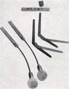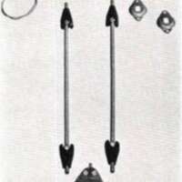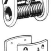 Insert-type hinges might be classified as semiflexible hinges, since they provide a degree of stability somewhere between that offered by the flexible Robin-Aids hinge or the leather strap and the solid steel hinges. They are generally used on medium below-elbow prostheses where sufficient stability cannot be obtained with the flexible hinge but where the stump is long enough to provide sufficient stability so that the metal-strap hinges are unnecessary. Insert hinges are installed in "ears" on the distal end of a leather arm cuff so that the cuff may be hinged about the proximal end of the forearm socket. The method of assembly is illustrated in Fig. 10, top.